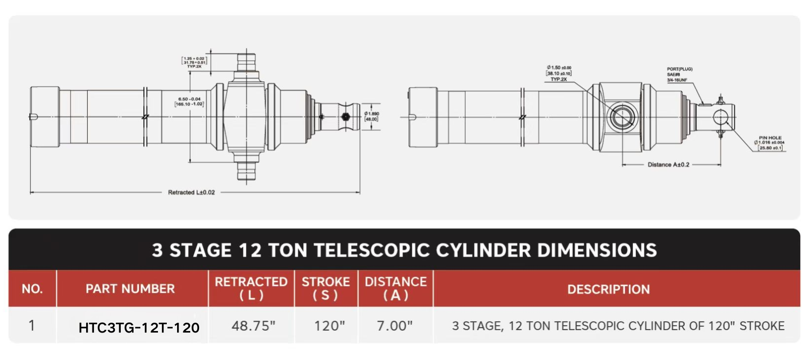 "HTC3TG-12T-120", 3-ступенчатые телескопические цилиндры массой 12 тонн с ходом поршня 120 дюймов.
