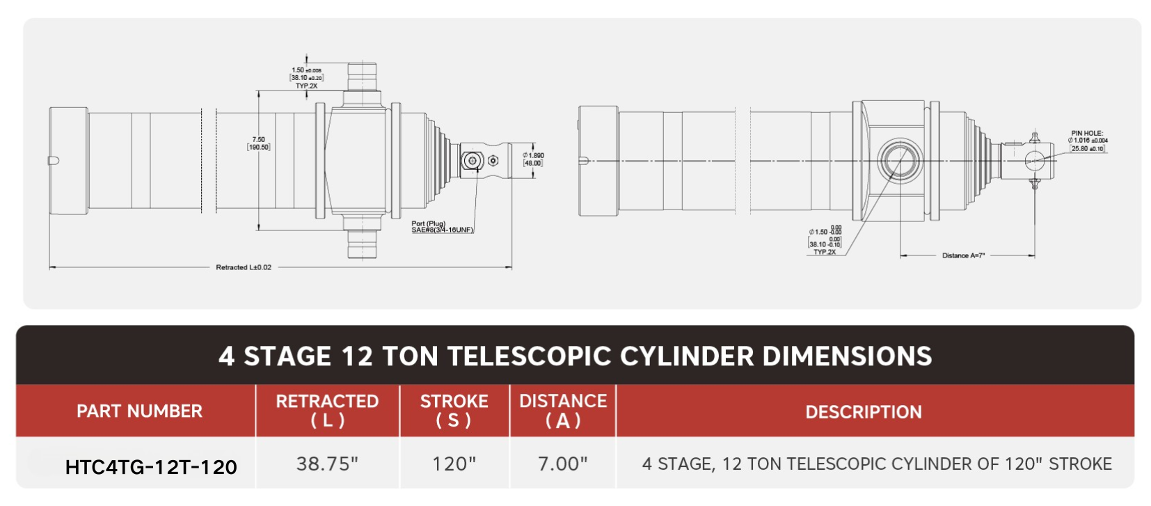 «HTC4TG-12T-120», 4-ступенчатый, телескопический цилиндр массой 12 тонн, ход поршня 120 дюймов