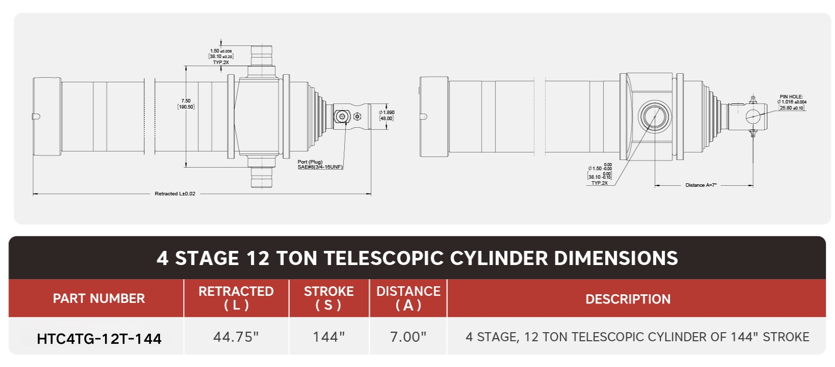 "HTC4TG-12T-144", 4-ступенчатый, телескопический цилиндр массой 12 тонн, ход поршня 144 дюйма