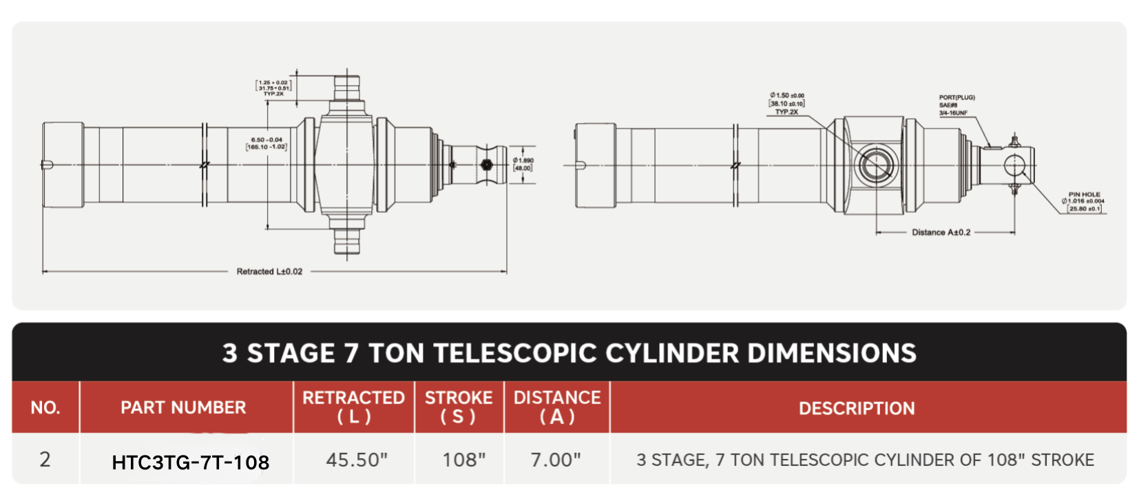 "HTC3TG-7T-108", 3-ступенчатые, телескопические цилиндры массой 7 тонн, ход поршня 108 дюймов