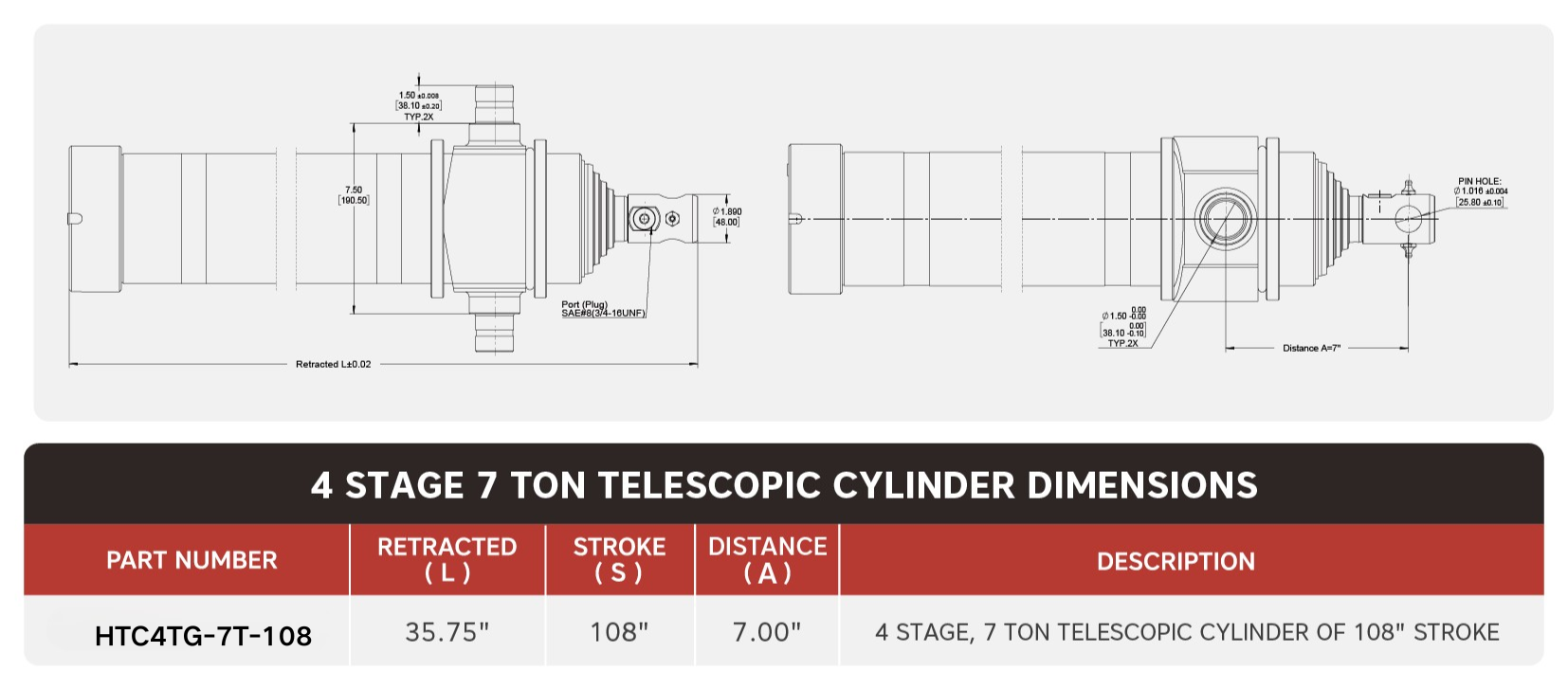 «HTC4TG-7T-108», 4-ступенчатый телескопический цилиндр массой 7 тонн, ход поршня 108 дюймов